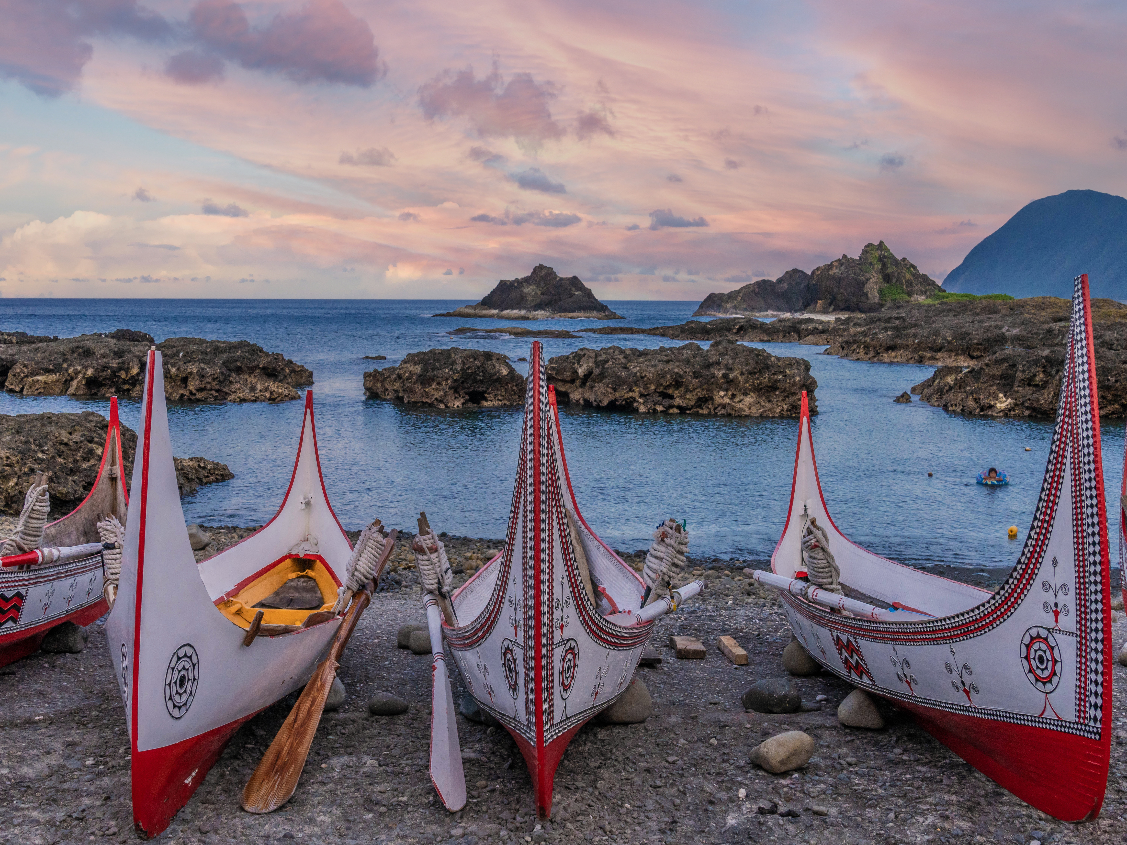 拼板舟是蘭嶼最具代表性的文化象徵,以多塊木板精準拼接而成,不使用一根鐵釘,完全依靠傳統智慧與手工技藝打造。船身以紅、白、黑三色為主,搭配眼睛圖騰、幾何紋飾,象徵守護、祝福與航行平安。